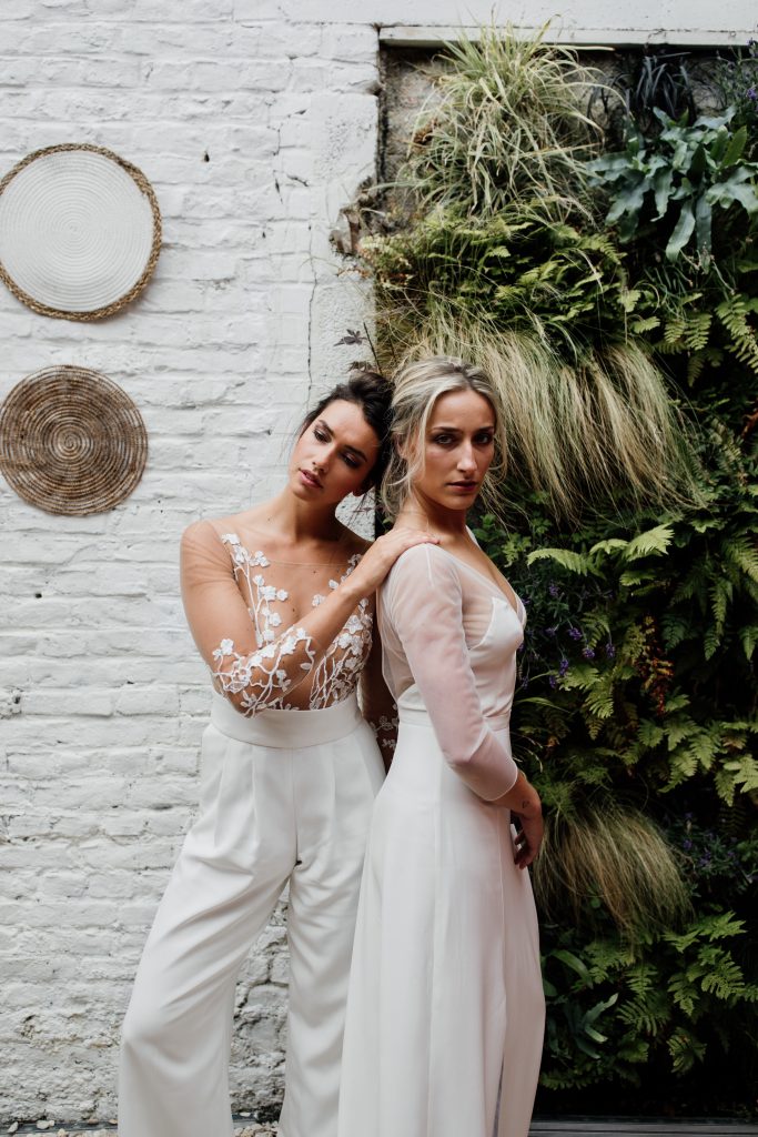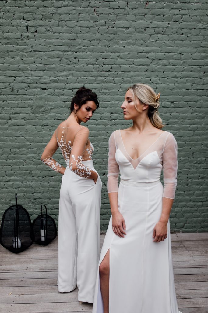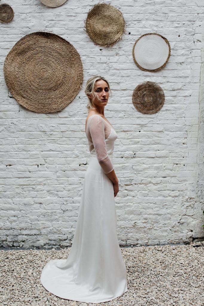 Vera est une robe qui joue l’équilibre entre opacité et transparence. Le crêpe de soie fluide compose une jupe légère, fendue sur le devant et terminée par une traîne discrète. Le tulle souple vient se poser sur le bustier, dessinant des décolletés en V à l’avant et dans le dos, plus profond et audacieux. Les manches trois-quarts en tulle aérien prolongent cette impression de légèreté. La robe se ferme au dos par un zip invisible, soulignant la pureté de la ligne.