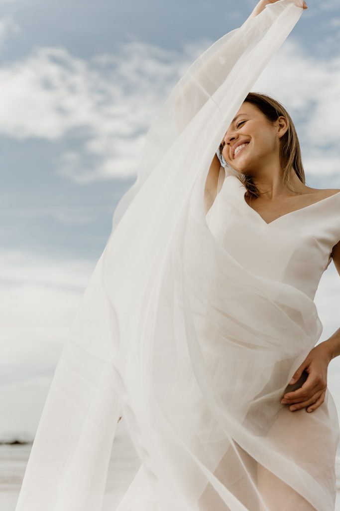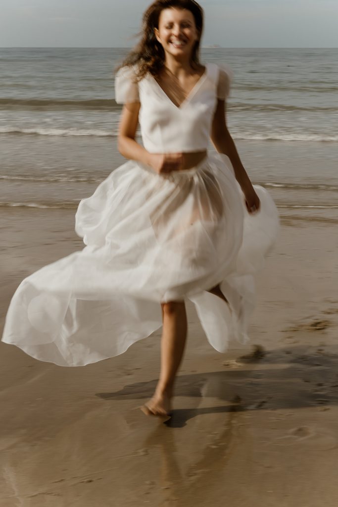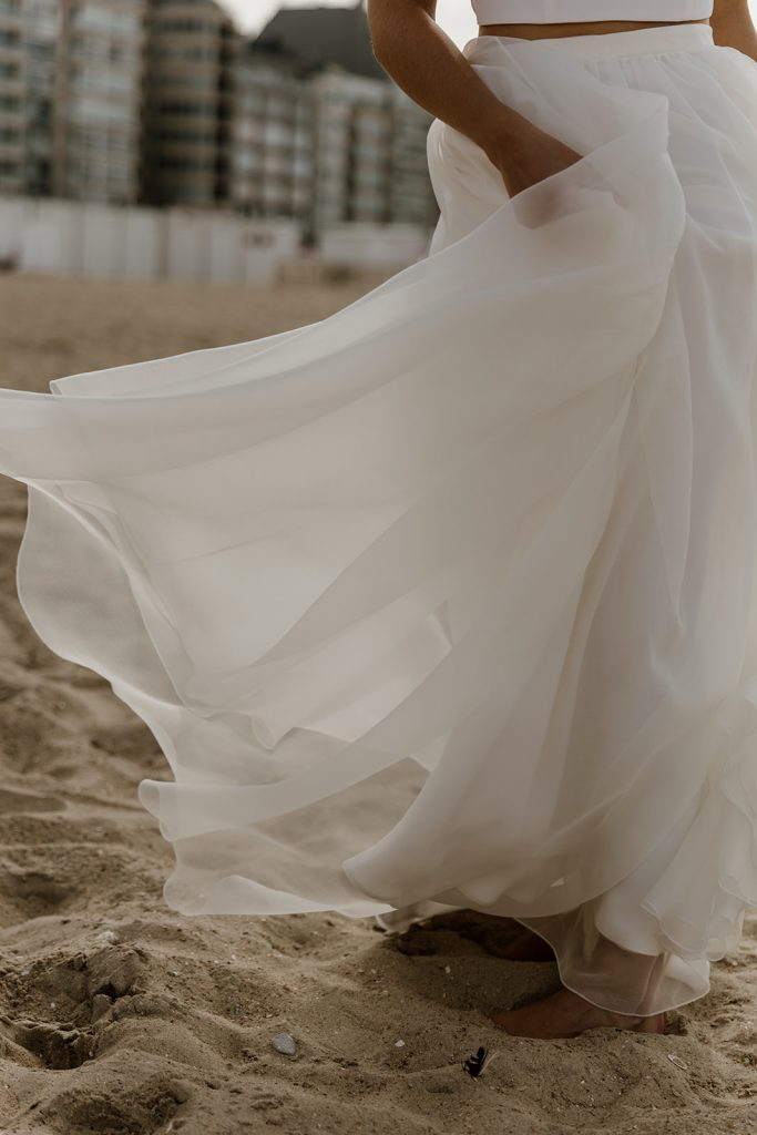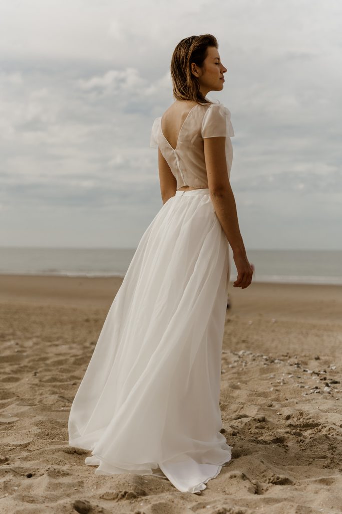 L’ensemble Calypso est composé de deux pièces : un haut en crêpe de soie, décolleté en V, rehaussé de manches courtes en organza. Son dos transparent, également en organza, se ferme par des pressions invisibles. Sa jupe en organza, fluide et légère, qui danse au rythme des pas.