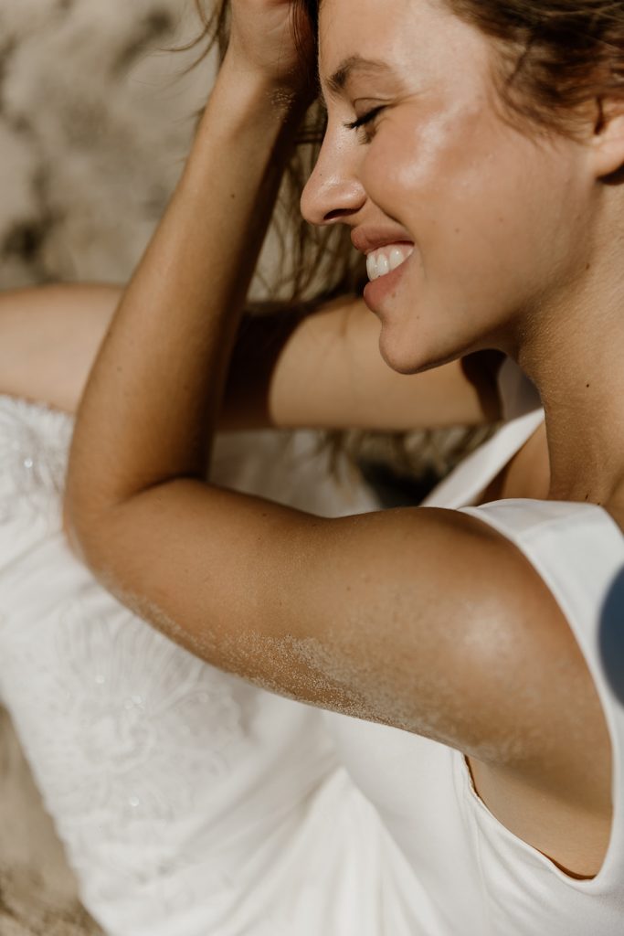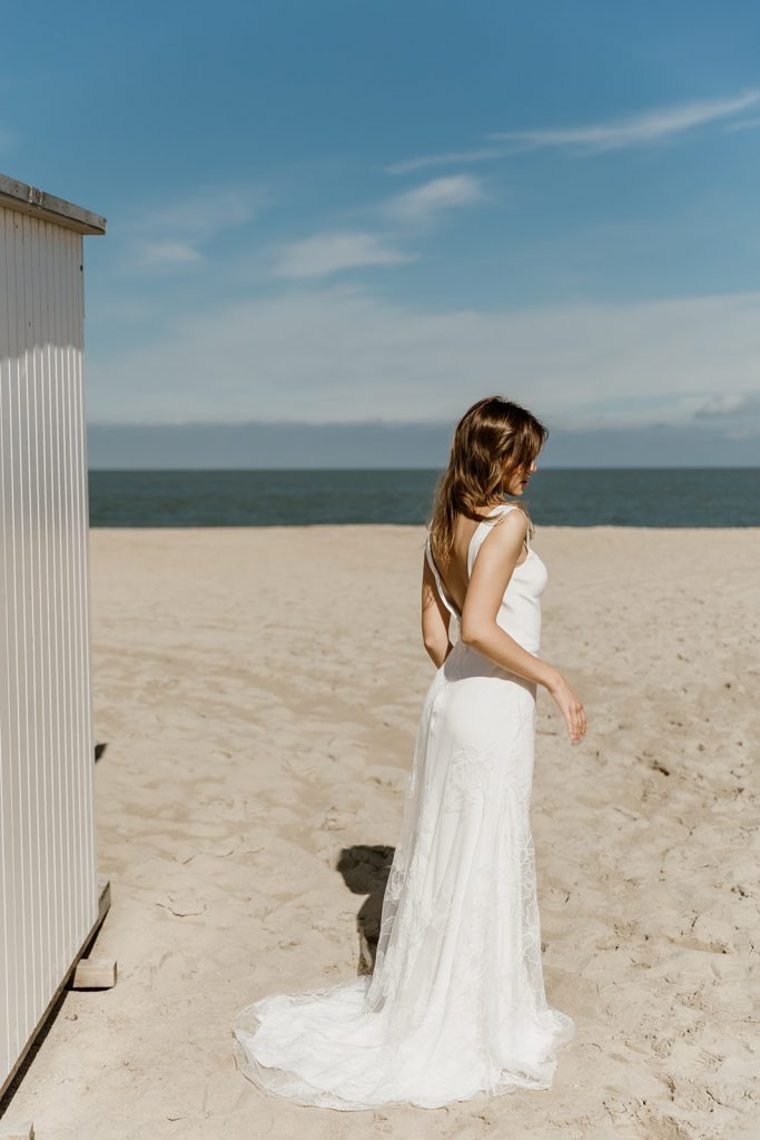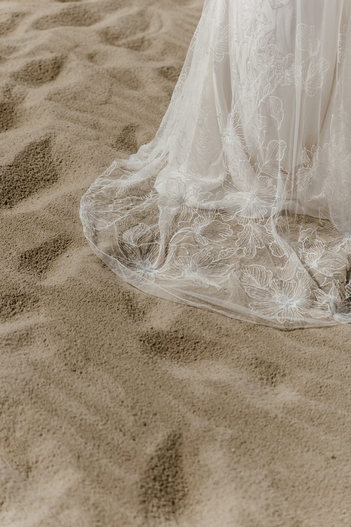 La pétillante Gaïa est une robe demi-sirène en crêpe de soie. Son décolleté en V profond, devant et dos, s’équilibre par des bretelles épaisses. Une sur-jupe amovible en tulle brodé de fleurs perlées sublime la silhouette et accentue la traîne, créant un éclat aérien.
