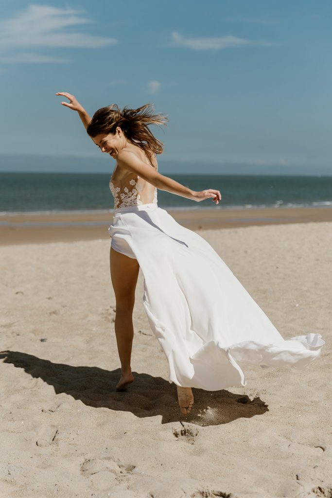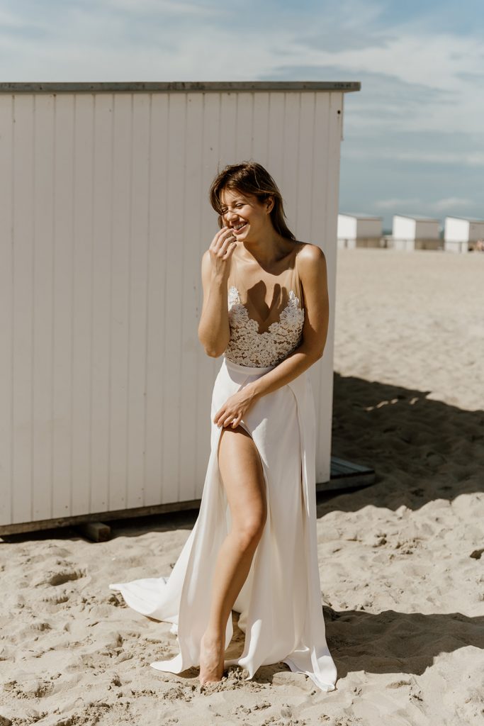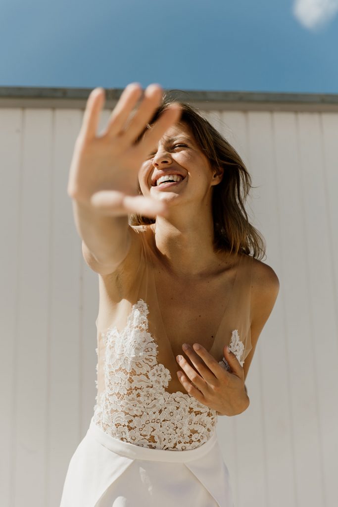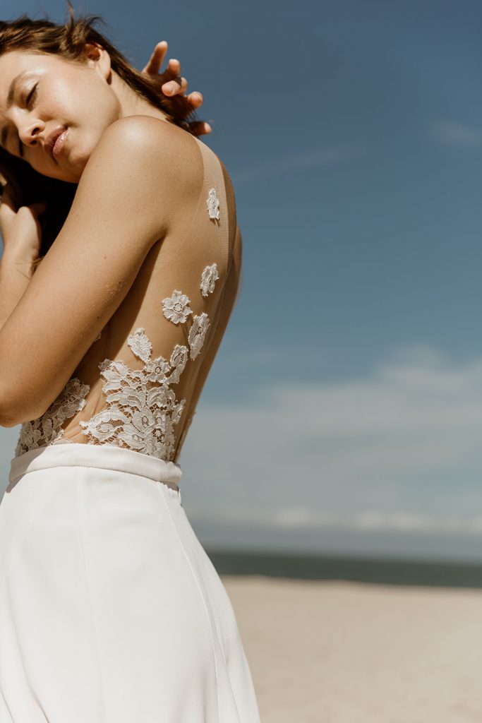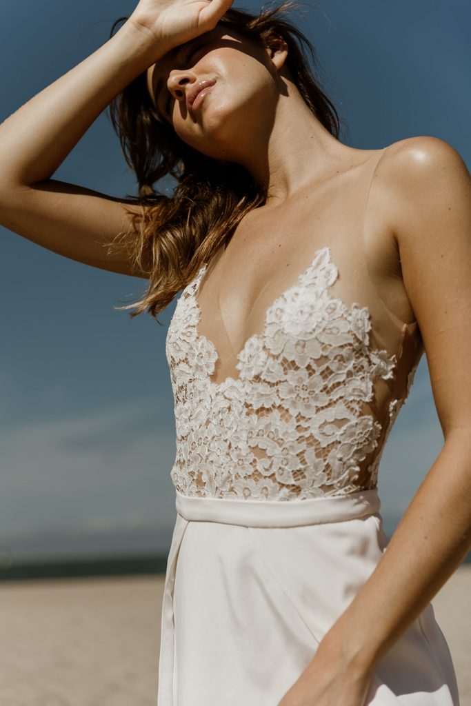 L’audacieuse Isis révèle un haut transparent en tulle invisible, appliqué de dentelle de Calais florale à la main. Son décolleté en V est plongeant devant et dos. La jupe, fluide et évasée, s’ouvre par deux fentes et une découpe arrondie sur le devant des hanches. Elle se ferme subtilement par un zip invisible dans le dos.