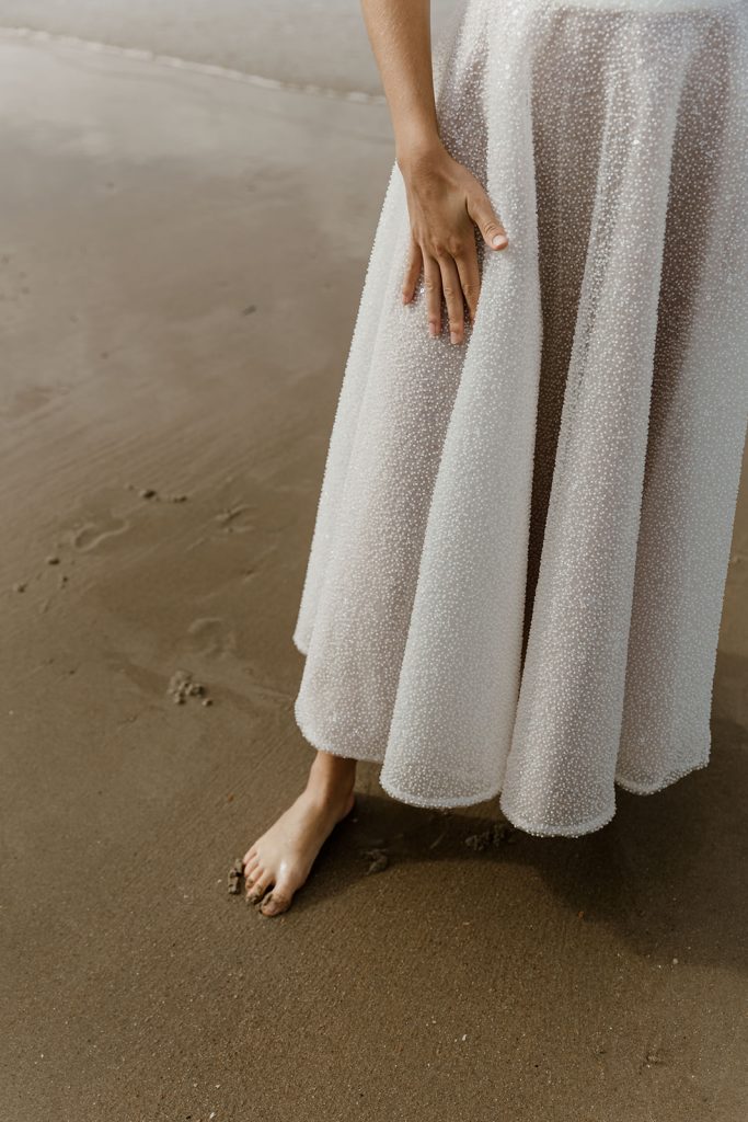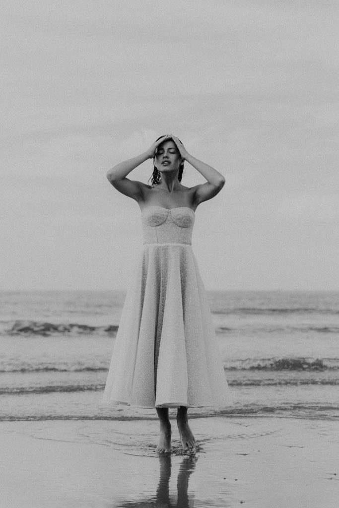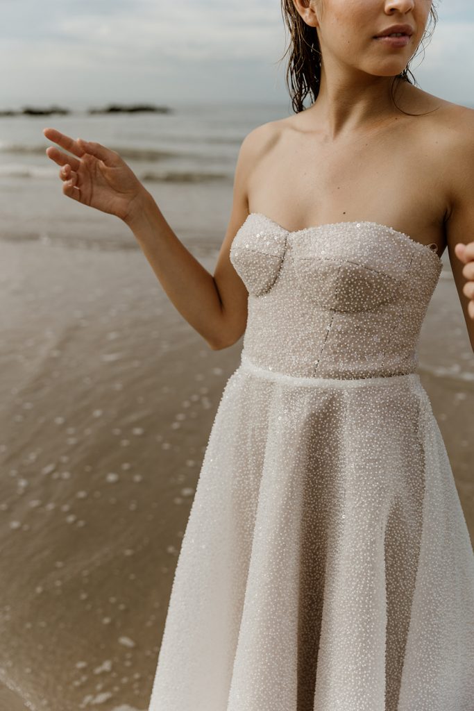 Nausicaa est une robe midi corsetée, en tulle brodé de perles de verre. Son fond rosé apporte une douceur et un raffinement à son volume patineuse. Elle se ferme par un zip et des pressions invisibles dans le dos pour ne pas entraver l’esthétique du modèle.