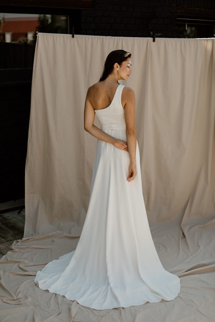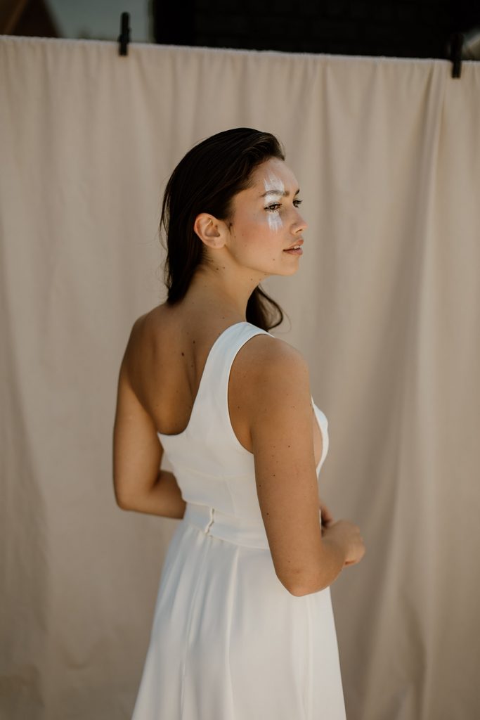 Nola est une robe asymétrique, marquée par une seule bretelle. La jupe est fluide et évasée, se posant délicatement sur les hanches. Des empiècements de tulle invisible ornent les côtés de la poitrine, l’un d’eux dissimulant une fermeture invisible à pressions. Une ceinture épaisse vient marquer la taille et structurer la silhouette.