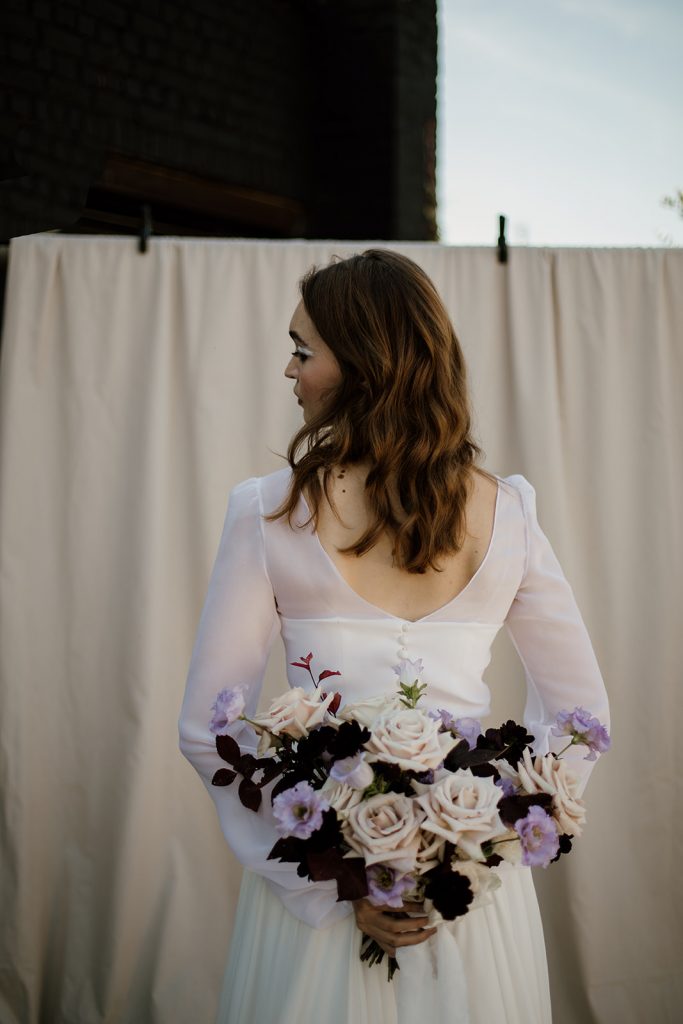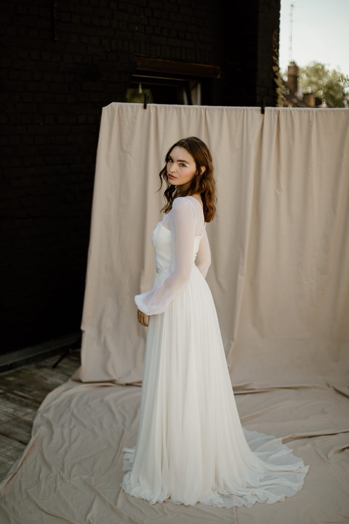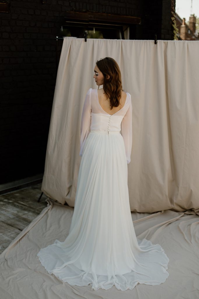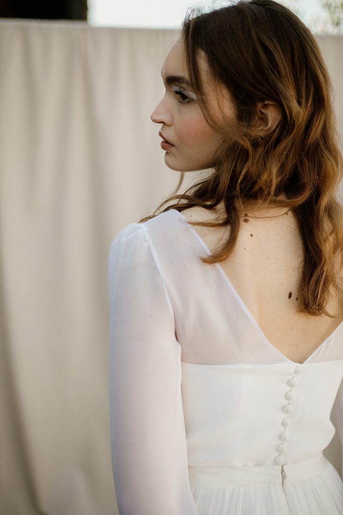 Oak est une robe effet bustier coeur en crêpe de soie, fermée par une ligne de boutons délicats. Elle se distingue par sa blouse transparente intégrée en crêpe georgette, à col légèrement V échancré et manches longues bouffantes. Le dos en V, peu profond, ajoute une note de douceur. Sa jupe fluide en georgette de soie s’évase avec légèreté.