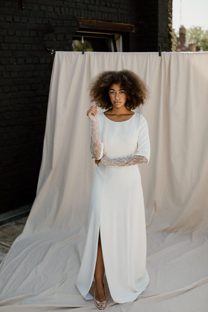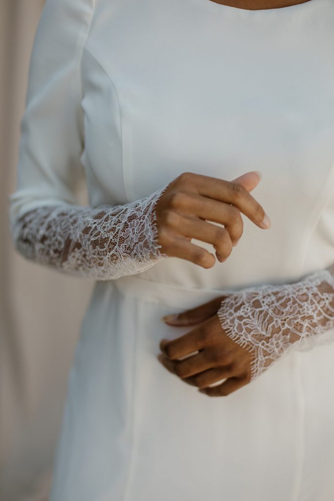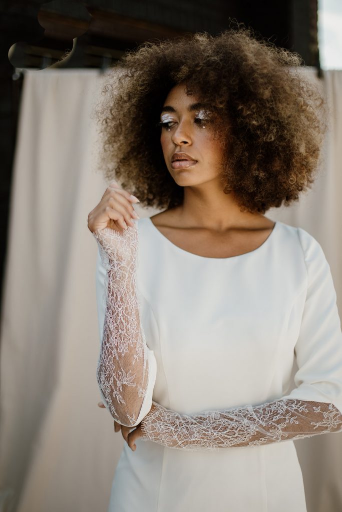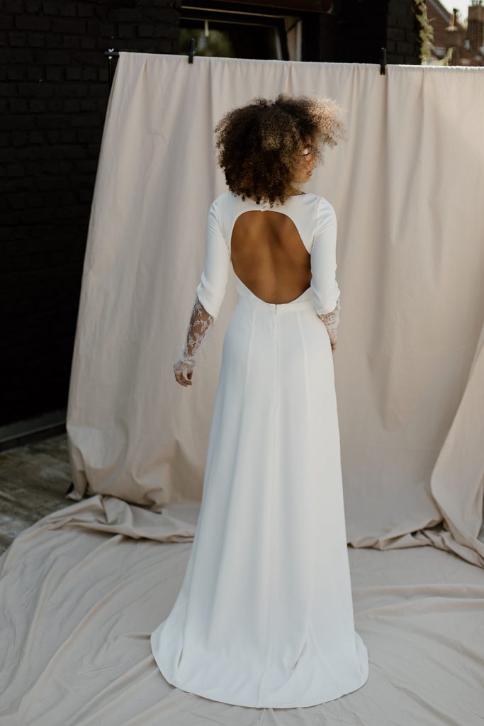 Oya est une robe en crêpe de soie, au col rond et manches longues. À partir du coude, la dentelle de Chantilly prend le relais, se terminant par des poignets festonnés. Le devant, minimaliste, révèle une fente et une jupe évasée. Le dos nu contraste avec un col fermé par de fins boutons et une large ouverture arrondie.